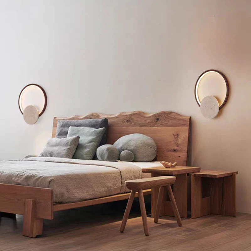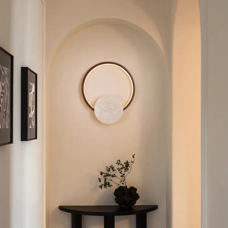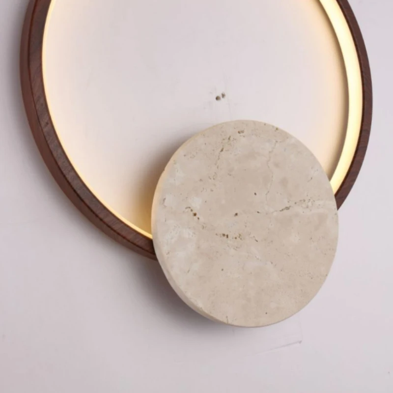 Natural Stone LED Wall Light Round Dark Wood Dimmable For Indoor Parlor Bedroom Stairs Atmosphere Sconce